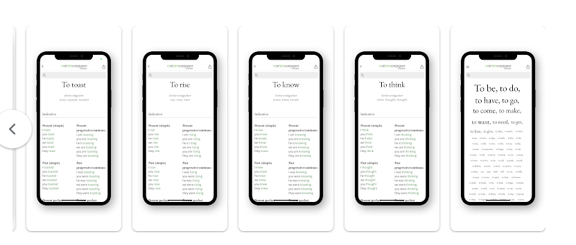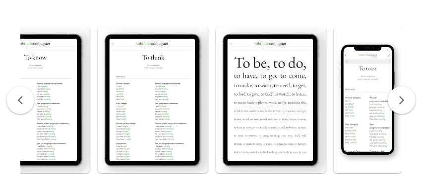 ويتيح للمستخدم كتابة أي فعل بأي صيغة أو زمن، وعند الضغط على زر الإدخال، يعرض التطبيق جميع التصريفات بشكل منظم، بما في ذلك الماضي، المضارع، المستقبل، الجمل الشرطية، وأوامر الأفعال. كما يمكن استخدامه لتحليل الجمل الكاملة واستخراج الأفعال منها وتصريفها بدقة. التطبيق من تطوير شركة A9 SAS، نفسها التي تدير منصة Gymglish الشهيرة لتعليم اللغات.