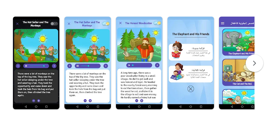 كما يوفّر خاصية الاستماع إلى القصص، وهو ما ينعكس إيجاباً على تطوير مهارات النطق وتحسين القدرة على التمييز بين الأصوات، مما يعزّز الثقة في استخدام اللغة.