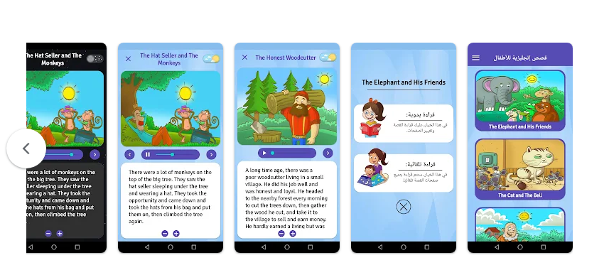 يمنح التطبيق الأطفال فرصة الاستماع إلى القصص أو قراءتها بأنفسهم، ما يتيح لهم التعرّف إلى المفردات والتراكيب اللغوية بشكل طبيعي وسلس، بعيداً عن أساليب الحفظ التقليدية.