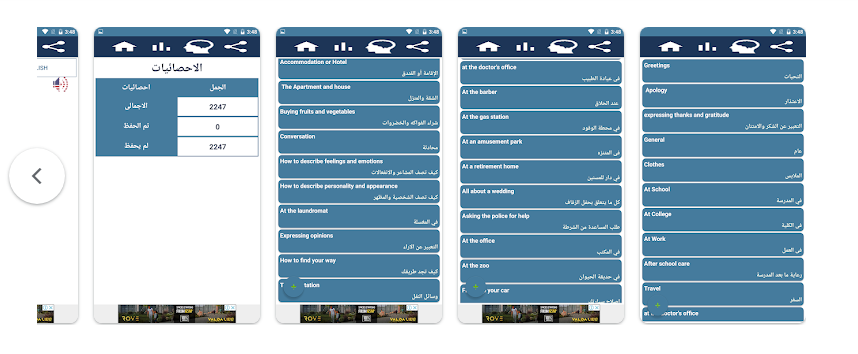 أسهل تطبيق لتعلم 2200 جملة إنجليزية مترجمة للعربية.