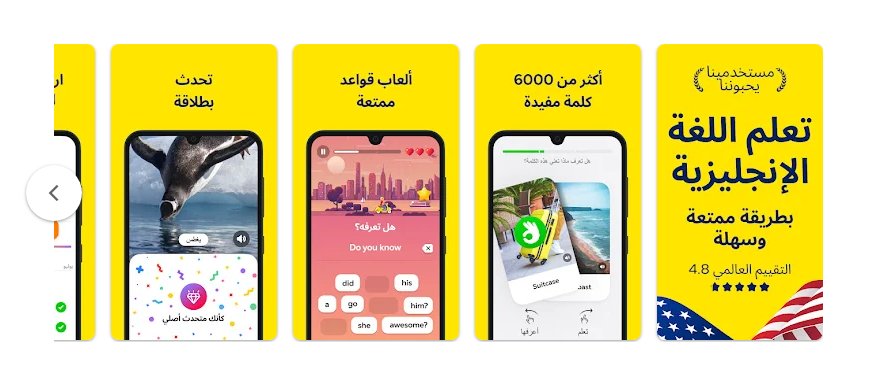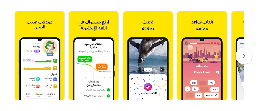 وإلى جانب ذلك، يقدم دروساً تفاعلية مدعومة بألعاب تعليمية تسهم في تنمية المهارات اللغوية وتحفّز المستخدم على الاستمرار والتقدم.