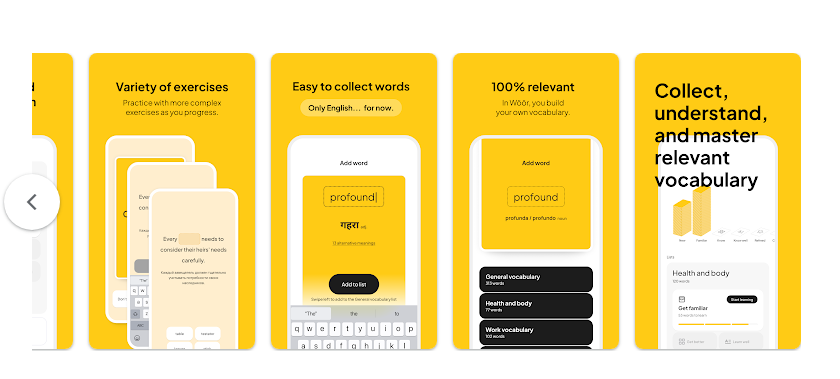 يُعد تطبيق Woor – English Vocabulary من الأدوات التعليمية التي تجمع بين القاموس الذكي والتدريب العملي على المفردات.
