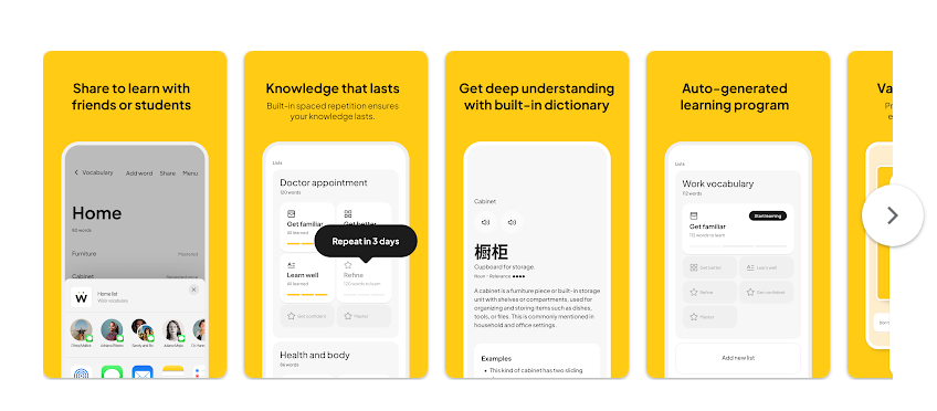 يوفر التطبيق مجموعة من التمارين المخصصة لكل مستخدم، مثل البطاقات التعليمية والاختبارات وتمارين ملء الفراغات ومهام الكتابة، مما يساعد على ترسيخ المفردات بشكل تدريجي وفعّال.