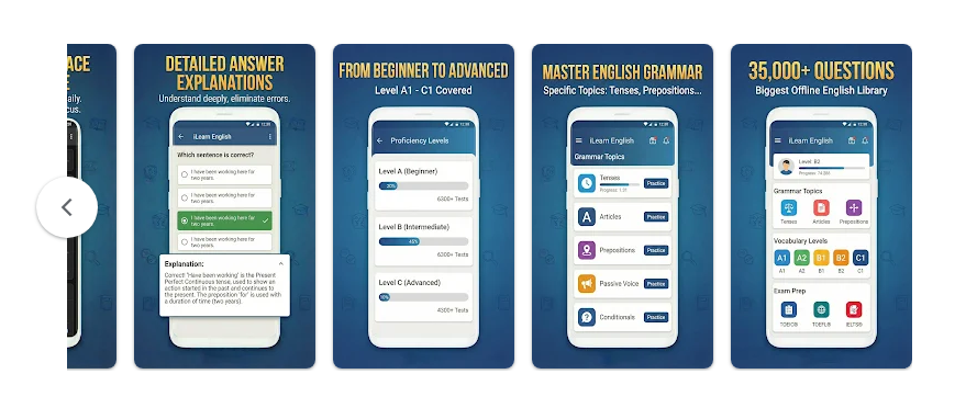 يحتوي التطبيق على أكثر من 30,000 سؤال تدريبي يغطي جميع المستويات من المبتدئ حتى المتقدم، مع التركيز على جميع المهارات اللغوية الأساسية والمتقدمة.