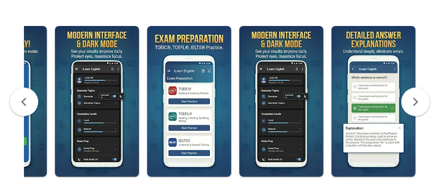 يتيح التطبيق تحضير شامل للاختبارات الرسمية مثل TOEIC®، TOEFL®، IELTS®، بالإضافة إلى امتحانات المدارس والجامعات.