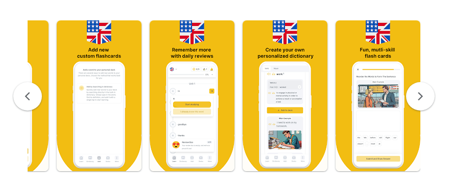 إضافة إلى ذلك، يقدّم التطبيق نظاماً منهجياً لتقسيم المحتوى، إذ تُجزأ قائمة الكلمات إلى وحدات تعليمية صغيرة ومنظمة، ما يسهّل التعلم التدريجي ويحدّ من الشعور بالإرهاق.