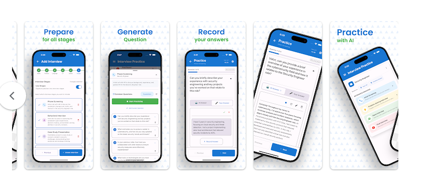 يقدم لك التطبيق الفرصة للتدريب على مراحل المقابلة المختلفة مثل المقابلات التقنية، السلوكية، ومقابلات الموارد البشرية، بالإضافة إلى المرحلة النهائية. كل مرحلة تحتوي على أسئلة مخصصة لها، مما يساعدك على التدرب على كل جزء من المقابلة بشكل منفصل وفي بيئة محاكاة واقعية.