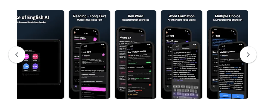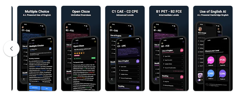 كما يحتوي التطبيق على تمارين تتراوح من مستوى B1 PET و B2 FCE وصولا إلى C1 CAE و C2 CPE.
