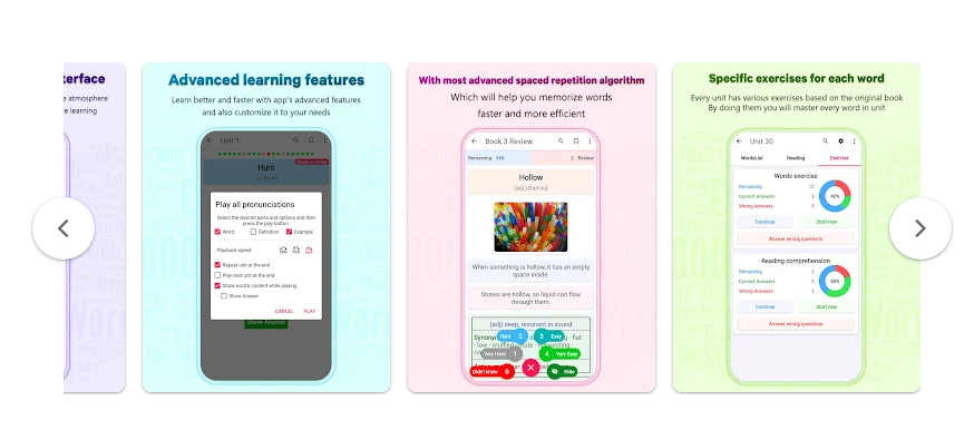 كما يضم التطبيق العديد من الميزات التي تجعل تجربة التعلم أكثر تفاعلاً وكفاءة، منها تتبع التقدم خطوة بخطوة، وتمارين عملية، بالإضافة إلى نظام مراجعة ذكي يعيد عرض الكلمات في الوقت المناسب قبل نسيانها.