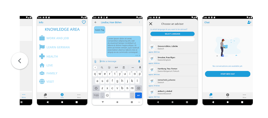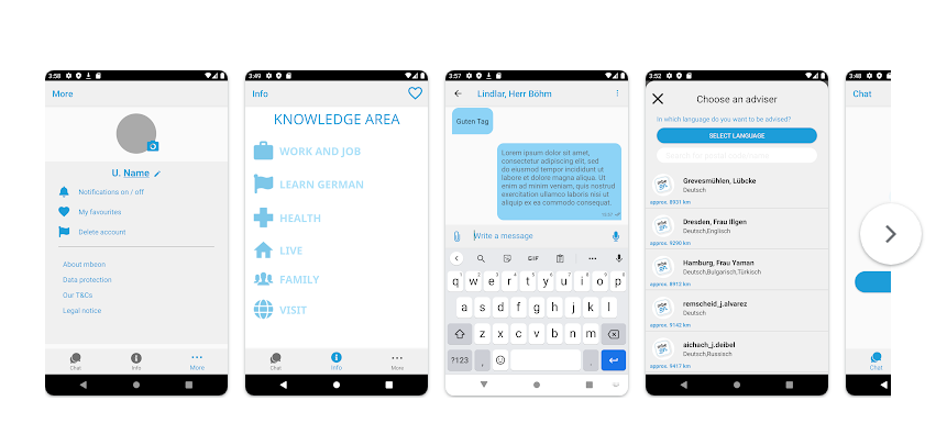 يتيح التطبيق للمستخدمين التواصل المباشر مع مستشارين معتمدين من خدمة استشارات الهجرة للمهاجرين البالغين (MBE)، لتلقّي إجابات دقيقة على أسئلتهم المتعلقة بشؤون الحياة في ألمانيا.